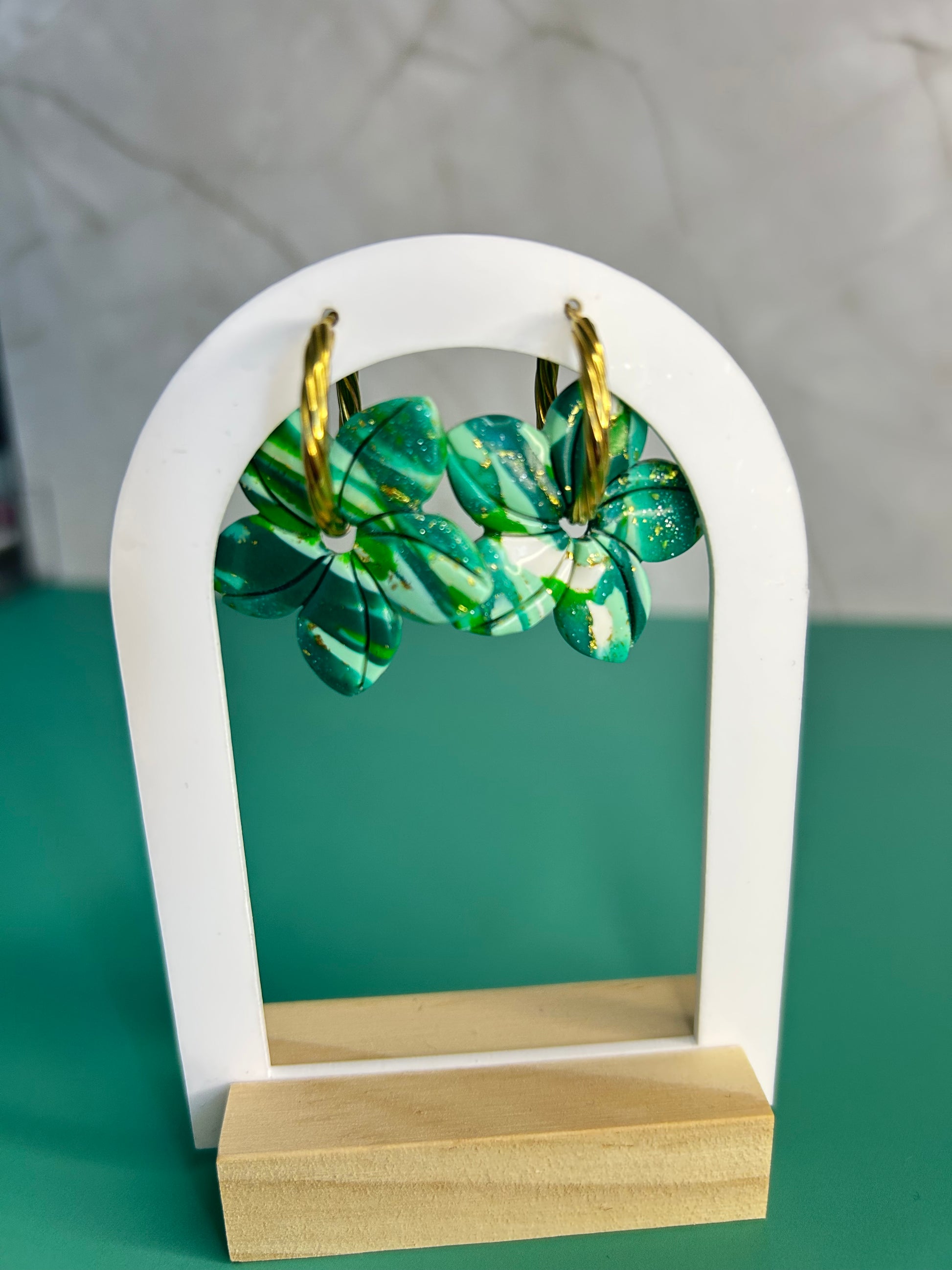 Boucles fleuries aux nuances de vert, montées sur anneaux dorés 💚✨