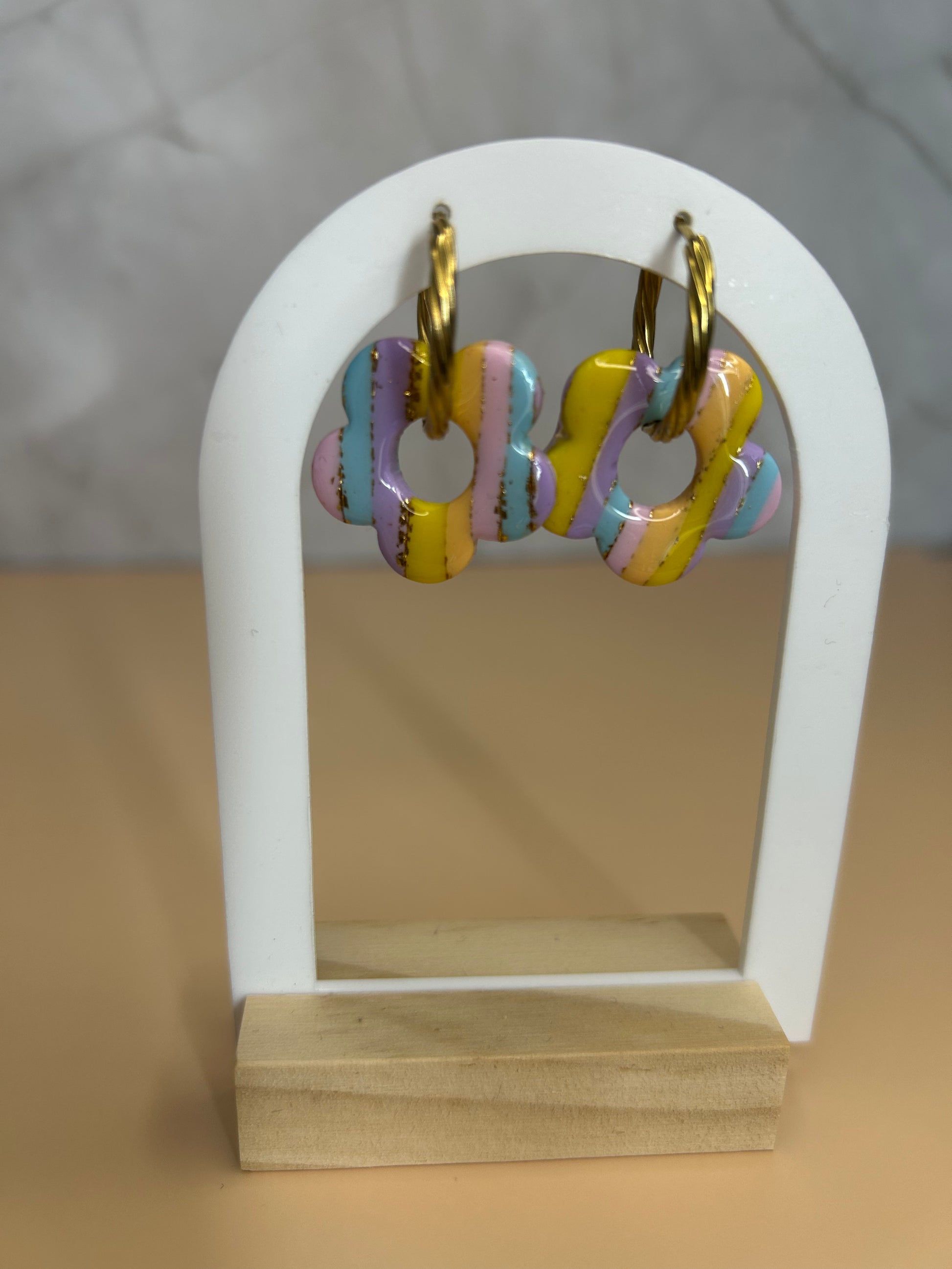 Chaque paire est faite à la main avec ses jolis tons pastel et ses anneaux dorés.