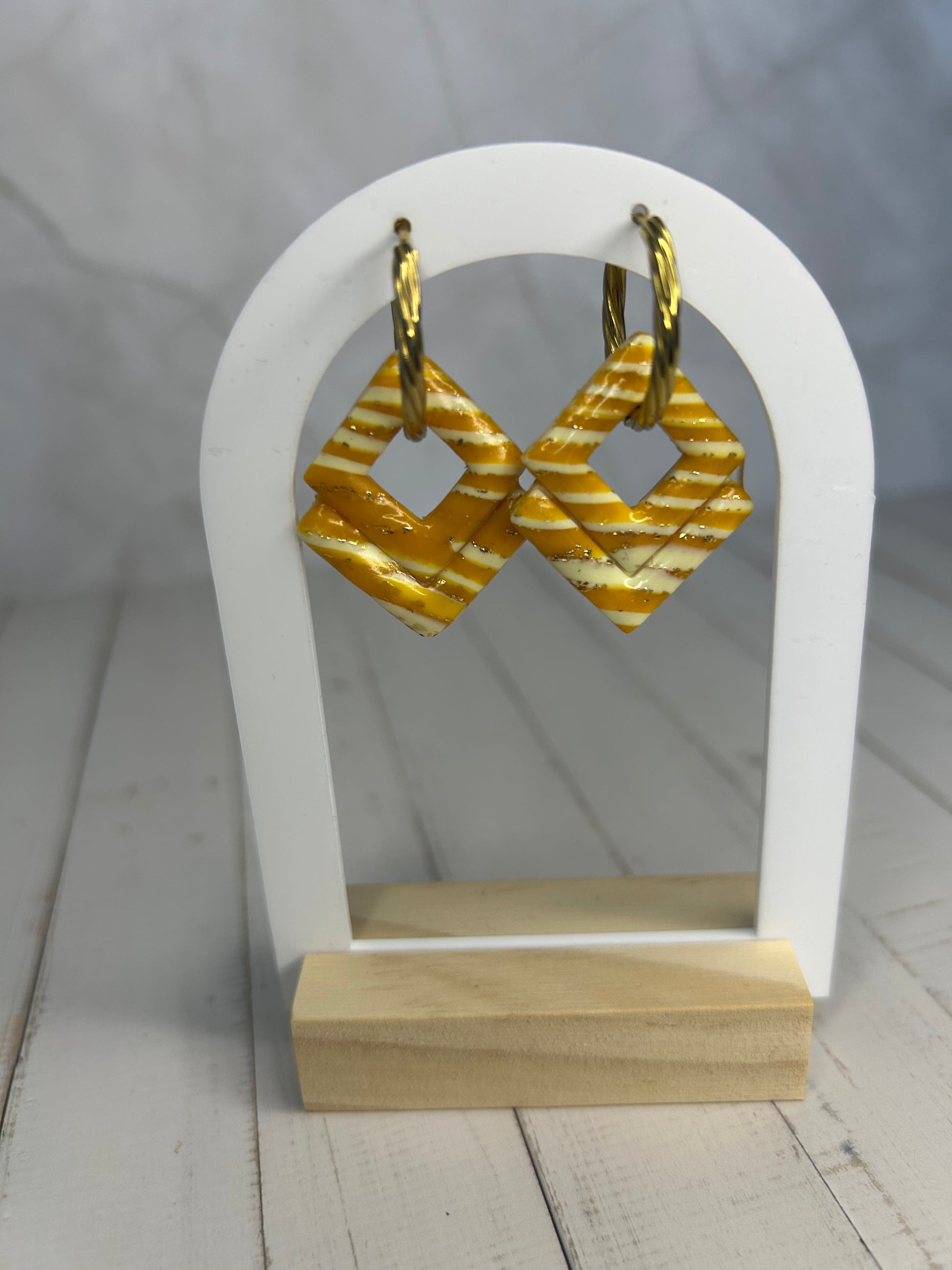 Boucles d’oreilles fleuries rayées jaune et blanc, montées sur anneaux dorés 🌼 Une touche solaire, légère et originale pour illuminer toutes vos tenues.
